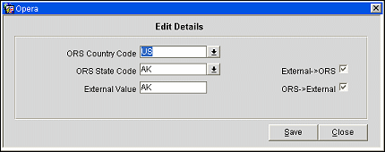 Search…in ORS/External System. Allows you to search for a specific conversion value. Depending on the OPERA/external system option button setting, the search entry will display conversion code values from the respective column in the table.
